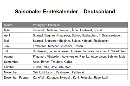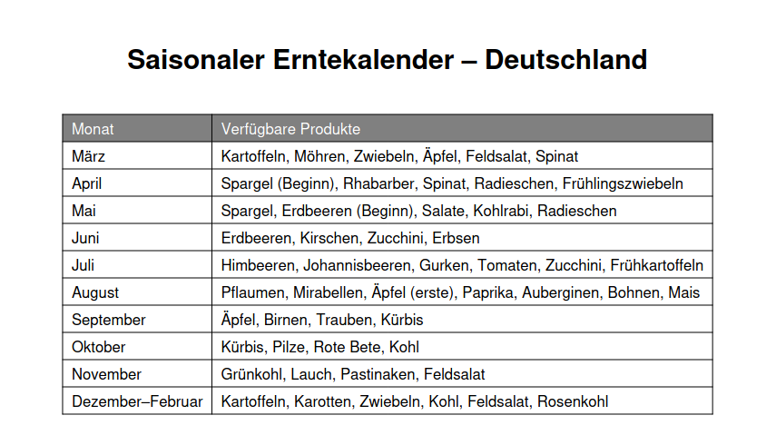 Hier ist ein saisonaler Erntekalender für Deutschland Saisonaler Einkauf schmeckt besser, weil keine Aromen verloren gehen, ist billiger wegen der geringeren Transportkosten, gesünder, weil Gott genau weiß welches Gemüse er für welche Jahreszeit geschaffen hat und einiges davon kann man in seinem Garten anbauen, falls man Platz hat. 🥕 Saisonkalender Deutschland 🌸 Frühling (März – Mai) März April Mai ☀️ Sommer (Juni – August) Juni Juli August 🍂 Herbst (September – November) September Oktober November ❄️ Winter (Dezember – Februar) Dezember – Februar 📝 Tipps